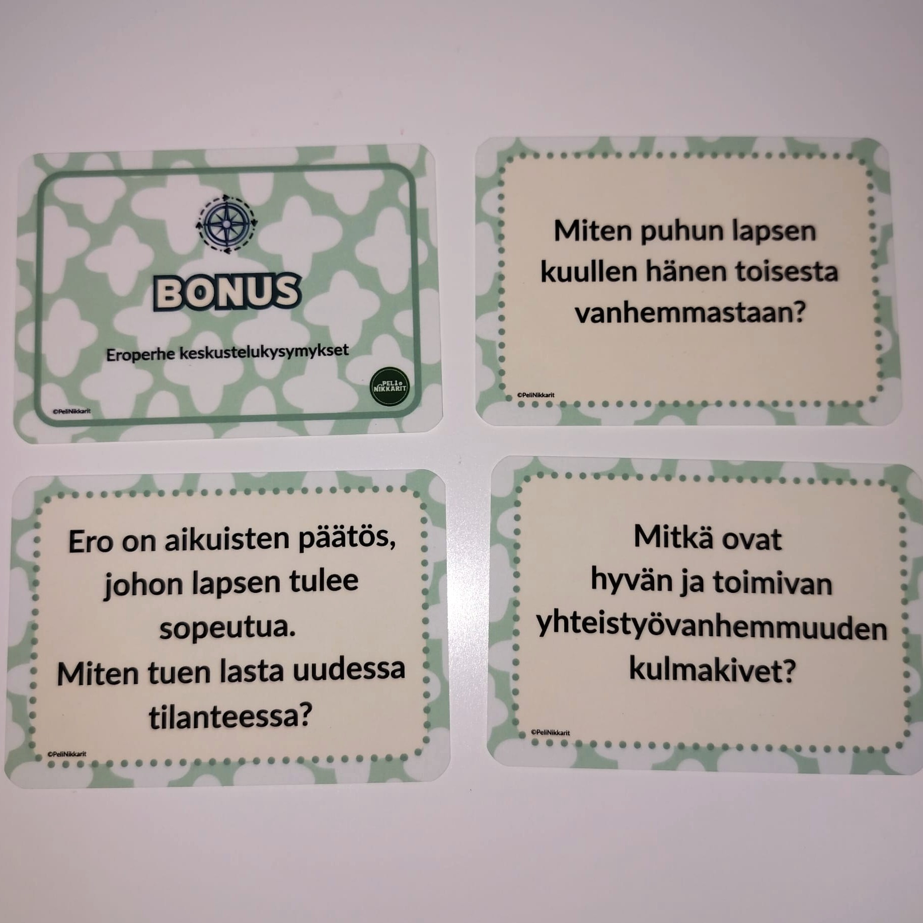 Bonuskortteja voidaan käyttää  myös itsenäisinä keskustelukortteina ilman Vanhemmuuden Suunta -peliä.